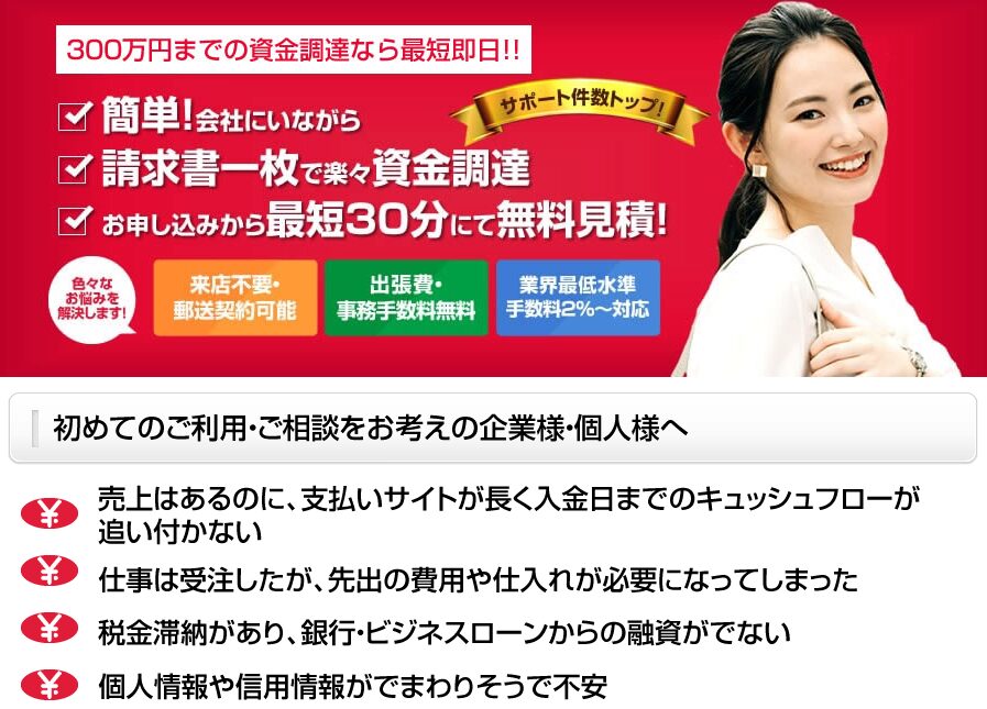 最短即日で資金調達! 公式サイトはこちら まずは気軽にお問い合わせを! ・最短30分で無料見積! ・オフィスや自宅で完結、スキマ時間でOK ・請求書一枚で楽々資金調達 商品名 アクティブサポート カテゴリ 資金調達